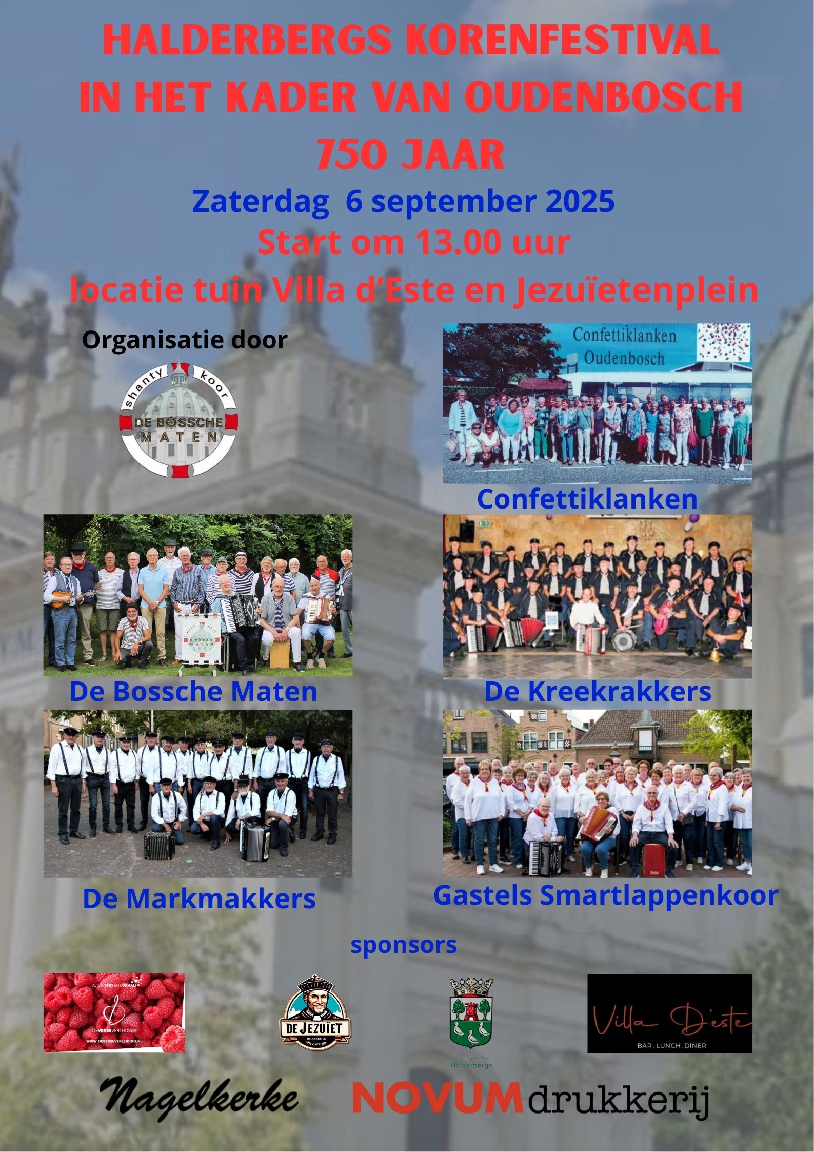 As part of Oudenbosch's 750th anniversary, singing society organises The Bossche Maten a festive choir festival. Enjoy performances by: