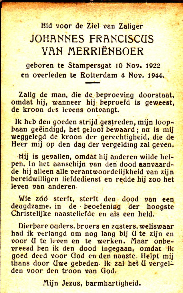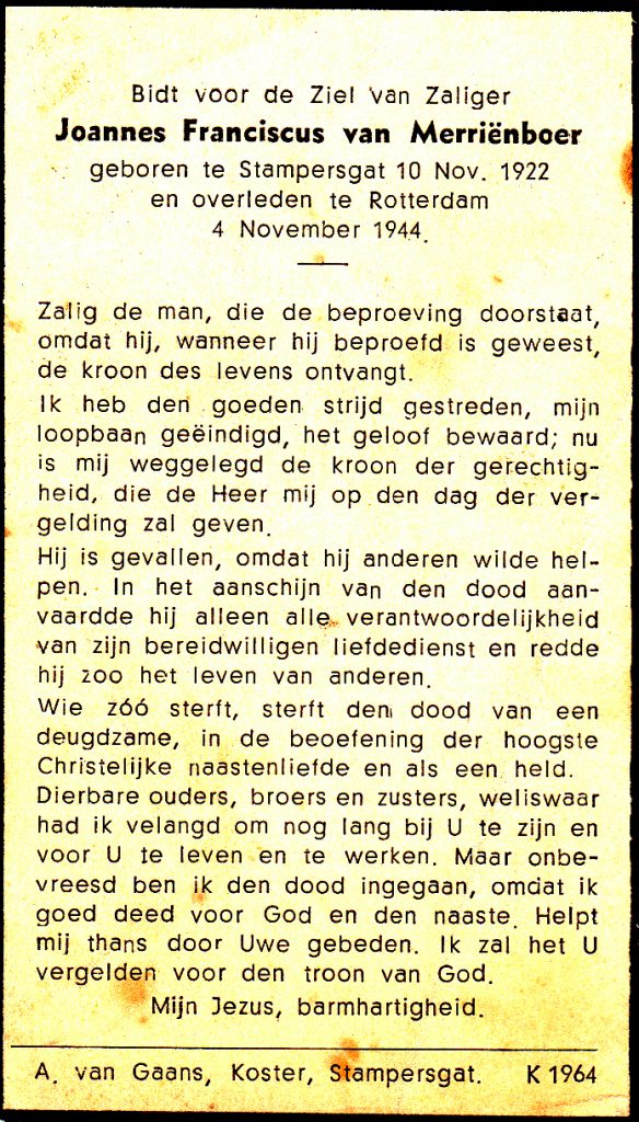 Jan van Merrienboer was a servant and child at home with Frie Vogelaars, who had a greengrocer's shop 'at the back end' (now Gastelsedijk West 80). During the liberation and the shelling of Stampersgat, the Vogelaars family had fled with Jan to the Huysmans family farm in the Prinslandse polder, where they found shelter in the potato store. Jan had met a German soldier who had told him he wanted to desert or go into hiding. Jan was willing to help the soldier go into hiding. However, he had to give him his pistol and pocketbook. The soldier did so and this proved fatal for Jan.
